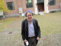 シナゴーク見学。まさしく、偶像崇拝否定の世界。上野もユダヤ教の聖帽を被る。